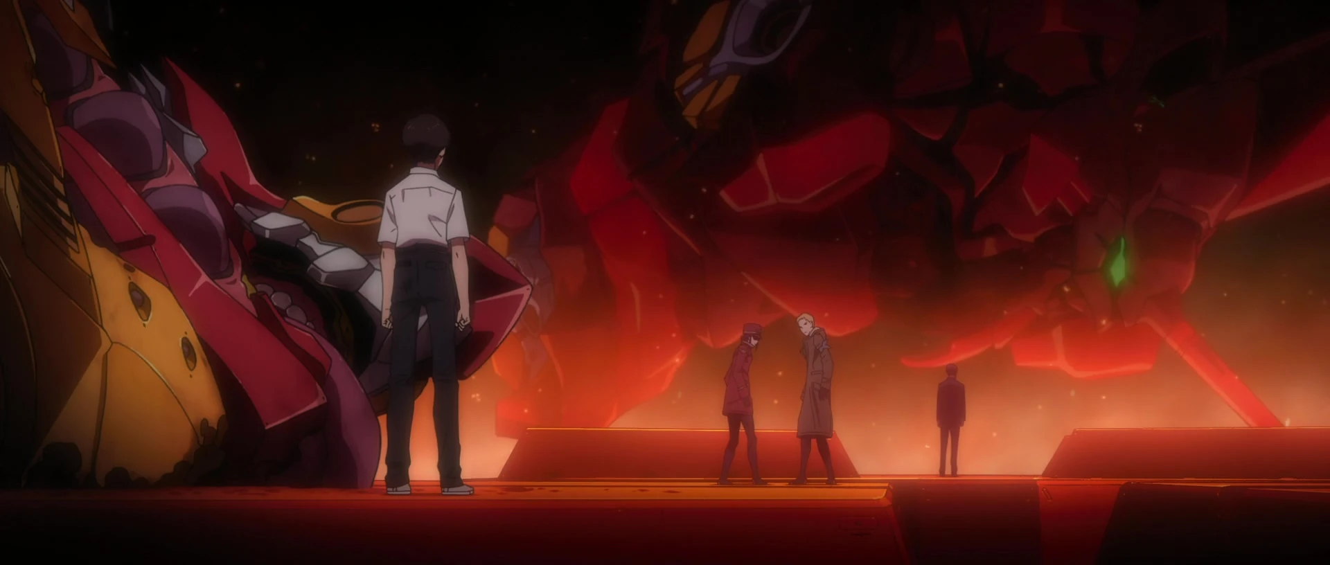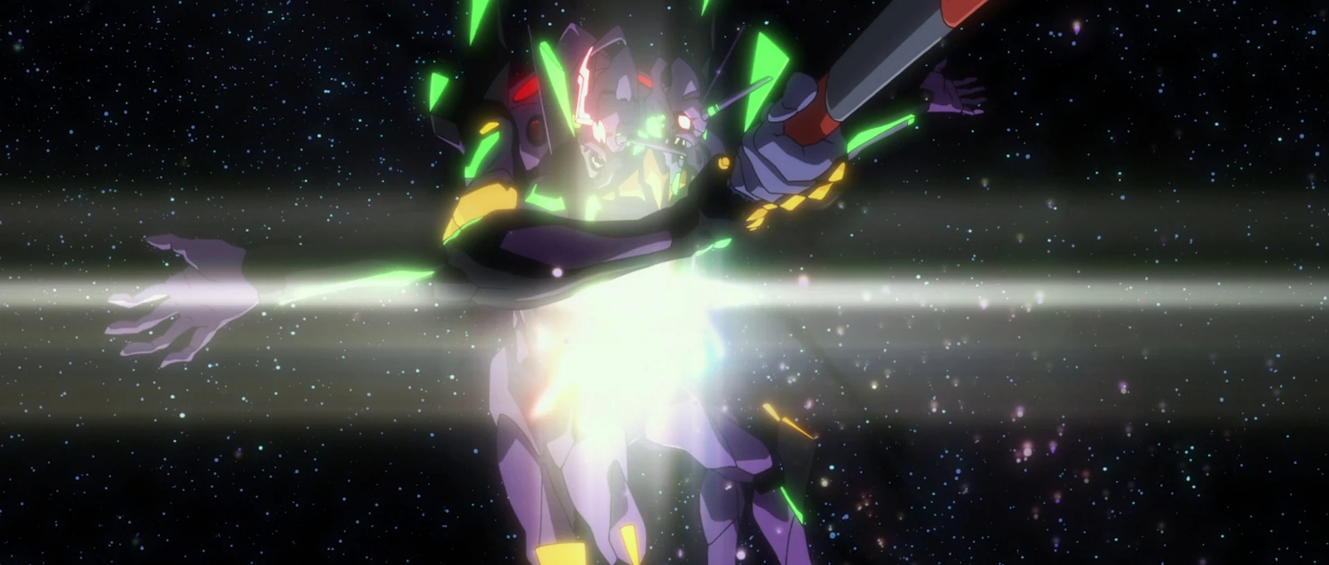 Позднее Синдзи освобождает из Евангелиона 13 Аску и Каору, а также Рей из Евангелиона-01, и решает переписать мир. Он заносит перед Евой-01 копьё Гая, чтобы пронзить им себя, но его останавливает Юи Икари, выталкивая его из Евы. Ева-01 и Ева 13 пронзают себя копьём Гая, инициируя Neon Genesis, в результате чего из реальности исчезли все Евы.