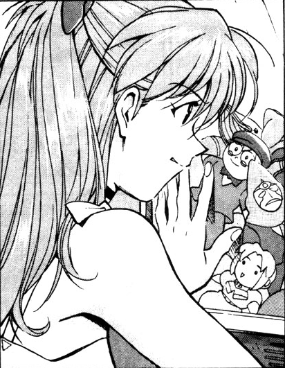 In this manga version, Asuka is a childhood friend of Shinji's. Although she still makes fun of him, she's also shown to have romantic feelings for him. As such, she was jealous when Rei joined them in school. The two of them dispute his attention for the remainder of the manga.