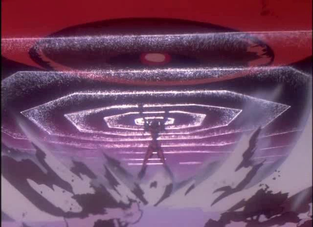 The tenth Angel, Sahaquiel, colossal in size and one of the most bizarre Angels in appearance, looking like a gigantic amoeba with a huge central eye. Its strategy is to zero in on NERV, dropping pieces of itself onto the Earth to calibrate its aim. Each piece has its own A.T. Field, which, combined with very high kinetic energy, cause devastation wherever they strike. It is believed that once the Angel finds its target, the main body will plummet to Earth. Even a near miss will convert Tokyo-3 into an extension of the Pacific Ocean . Misato orders all civilians evacuated in a fifty-kilometer radius[3], and concocts what seems to be an impossible plan. Using their A.T. Fields at full strength, the three Evas will catch the falling Angel with their hands and then destroy it. Ritsuko accuses Misato of putting her quest for revenge ahead of the mission[4].