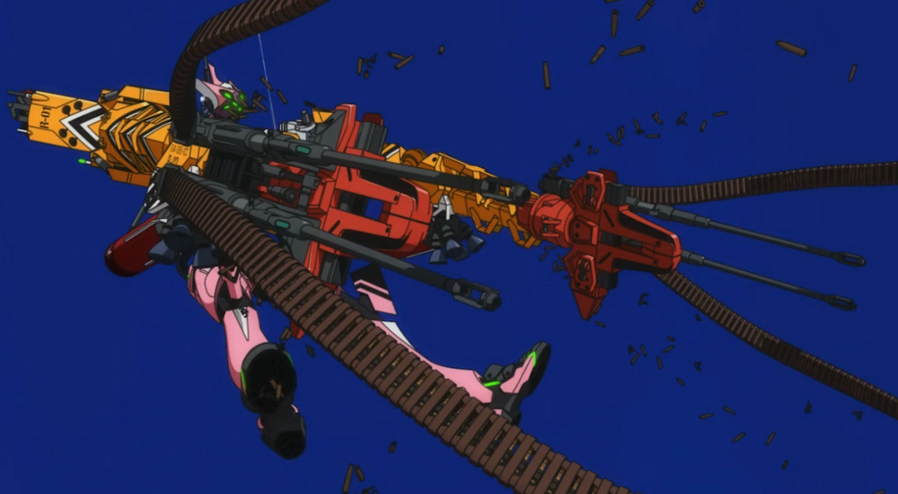 Introduced in Evangelion: 1.0 You Are (Not) Alone. A massive Gatling Gun (ガトリングガン?), utilized by Unit-01 against the Fifth Angel. When fired, this weapon drops a enormous amount of shell casings that crushed several vehicles on the ground. However, it deals no visible damage to the Angel.