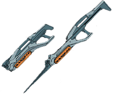 Sonic Glaive (ソニック・グレイブ?) is a spear-like weapon used to slice Israfel in half in Episode 09. It also appears in Episode 19, but isn't used. In real life, a glaive is a spear shaft containing a knife at the end rather than a spearhead. This may mean it's based on the same engineering as a Progressive Knife, but with an extended range.