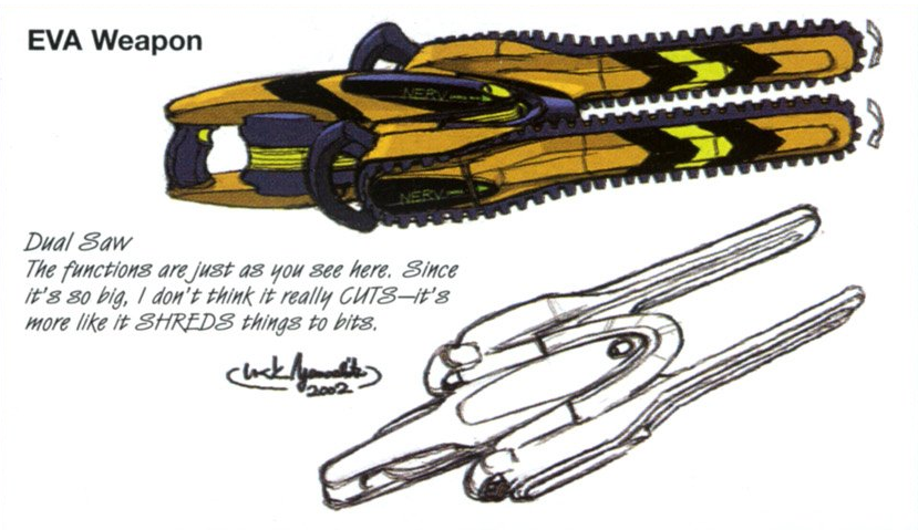 Anti-Material Circular Saw (アンチマテリアル丸ノコ?) is a weapon recovered from Euro-NERV during the Paris Assault Mission, this weapon is used by both Unit-08γ and New Unit-02α during Operation Yamato. Initially seen in a staff configuration, the weapon is later split in half to be used as as two hatchet style weapons. Appears in Evangelion: 3.0+1.0 Thrice Upon A Time.