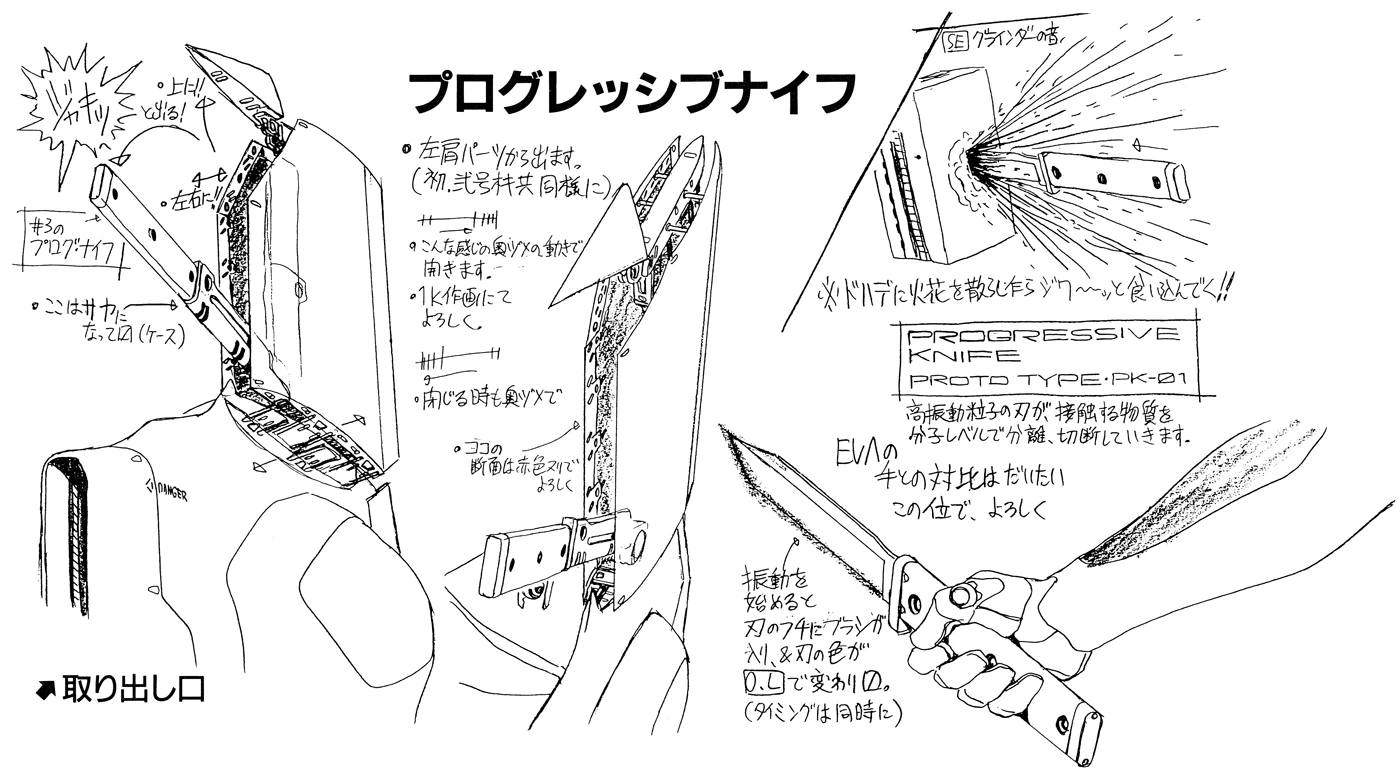 Progressive Knife (プログレッシブ・ナイフ?) is a combat knife contained inside the left shoulder pylon of an Evangelion who uses it, and is one of the Evas' basic weapons. The blade of the knife vibrates at an extremely high frequency,[1] increasing its cutting sharpness to the point that it can cut through the target at a molecular level. It is strong enough to pierce an Angel's core with little trouble. Unit-02 has two progressive knives equipped.