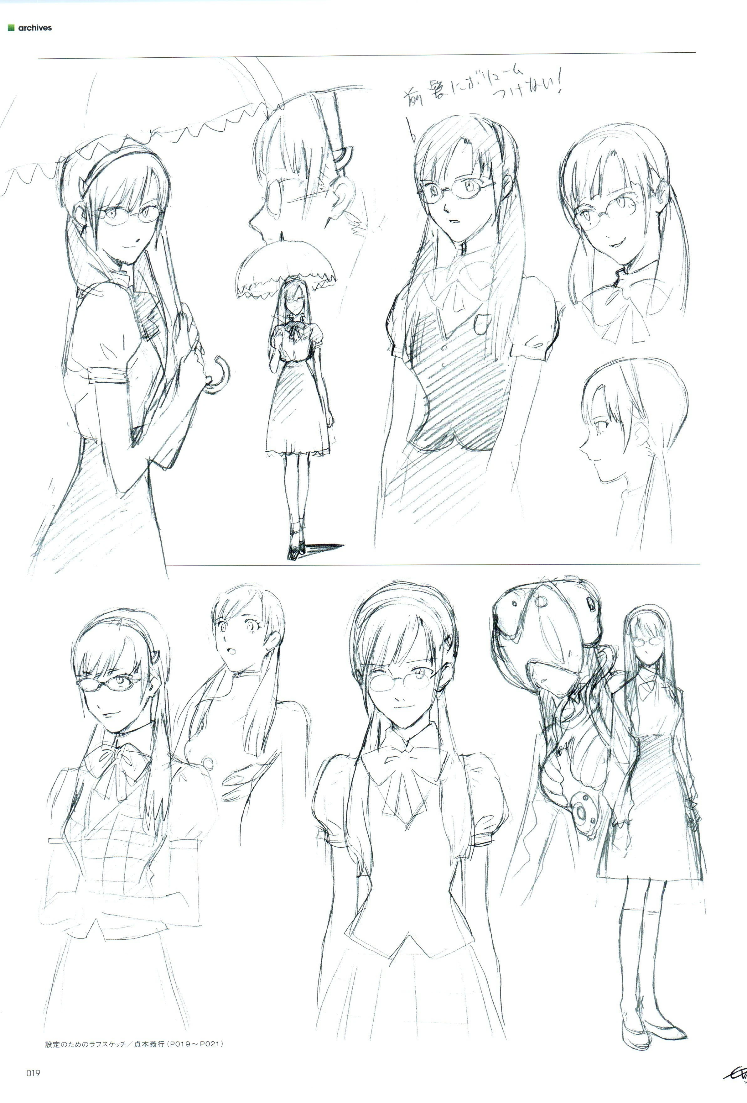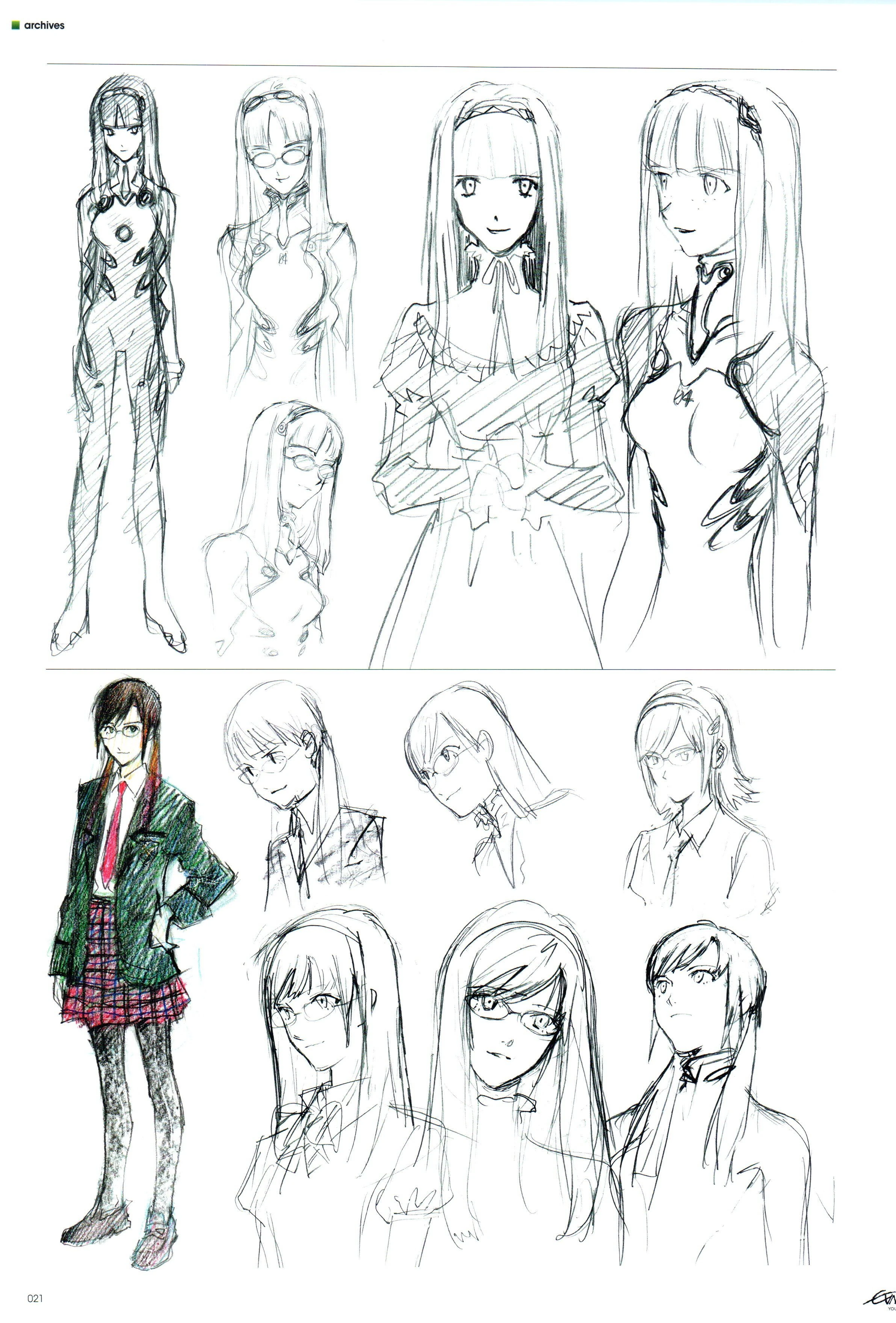 Similary to his other attempts to distance himself from Mari's conceptualization, Anno gave initially vague settei to Sadamoto and Tsurumaki. In one of her old character designs, her plugsuit is numbered 04 instead of 05 like she appears initially in the movie. Anno requested her design be based on a "Christian Missionary-style". Other early designs included a Victorian version of Mari, playing on English stereotypes, and her checkered skirt was in reference to Scottish stereotypes. Her early association with green and use of tights was in reference to pictures of British schoolgirls Anno brought to Sadamoto when he asked for references. Initially, he also considered giving her a long-sleeved blazer.[49][50] Sadamoto concluded that her glasses were a simple but effective way to differentiate her from the other main female characters.[51] Mari was intended to attract a new kind of fan, and a character that could be "broken". [52][8] Additionally, Anno thought Mari's glasses were a good way to showcase their animators' talent, as it was much harder to animate them in the original series. Hearkening back to his experiences with FLCL, Tsurumaki had also attempted at the time to differentiate female character Haruko from Evangelion characters, particularly Misato, and avoid comparisons, further solidifying his leading role in conceptualizing Mari.[53]