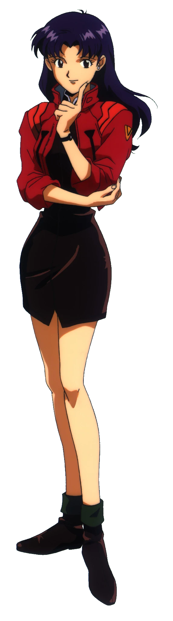 Misato is a young woman with long dark violet hair that is wavy with bangs parted to the sides and dark brown eyes. She wears a sleeveless black flapper dress with a cross necklace, a fancy red jacket with stylized accents, green socks, and black boots, but she wears more outfits throughout the series. Misato is known to be a very attractive woman, as she has been cited multiple times throughout the entire series to be a "babe", by Ikari's male classmates.