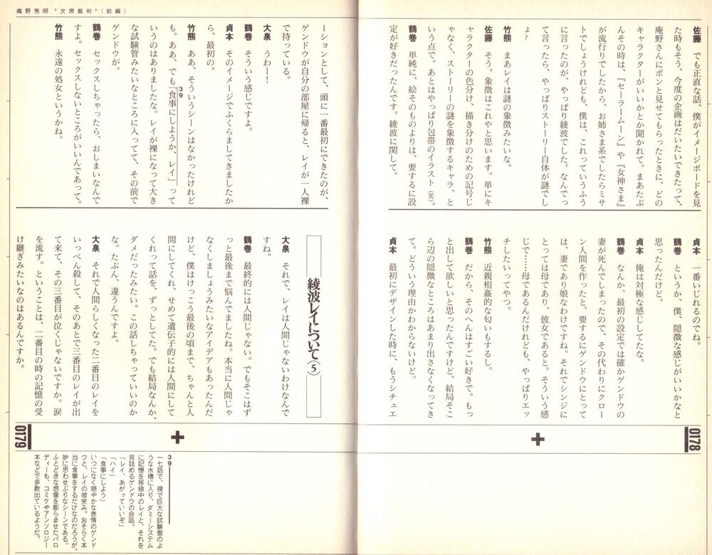 - ↑ 43.0 43.1 Oizumi: Exactly. And, on the topic of substitutions, can we think of Rei Ayanami as being a person like your mother?