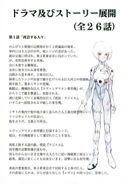 "A: Even more distant. The first time you see Rei, she is all bandaged up. The group Kinniku Shojo Tai has a song called "Hotai de Masshiro na Shojo" ("The Girl White with Bandages"). When I heard that song, an image popped into my mind, and I drew Rei according to that. I thought, "I'd like to draw a girl like that." This girl who is fated to pilot a robot. I wanted to draw her even before I heard of Shinji. There were two things that went into the decision to make her eyes red: one is the fact that she didn't have enough outstanding features, and the second is from a buisness standpoint, the makers of the game wanted her differentiated from the other characters, but personnally I think it turned out to have a great effect. She's so quiet you can only tell her character from her gaze and her facial expressions, so she leaves the impression of having a strong stare." - Yoshiyuki Sadamoto - "My Thoughts At The Moment" - ↑ 22.0 22.1 Sadamoto, Milano Manga Days 2014