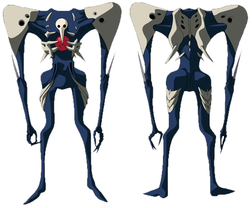 Sachiel's appearance is tall, thin, and humanoid, it is slightly larger than an Evangelion, and functions both on land and in water. Its proportions are unlike those of a human; its arms are long enough to reach below its knees and its legs and feet are elongated and disproportionate. It lacks a proper humanoid head and neck, but like other Angels, contains a core in the center of its solar plexus. Its head is barely mobile and appeared to primarily be made up of bone and is structured much like a bird's, even having a long beak. After Sachiel regenerates from an N² mine attack, a second head emerges from its body, with a shorter beak than the first. Sachiel has red irises, which are able to be seen deep within its eye sockets. Sachiel possesses blood of a bluish-purple color, making it unique among Angels for whom blood has been observed.