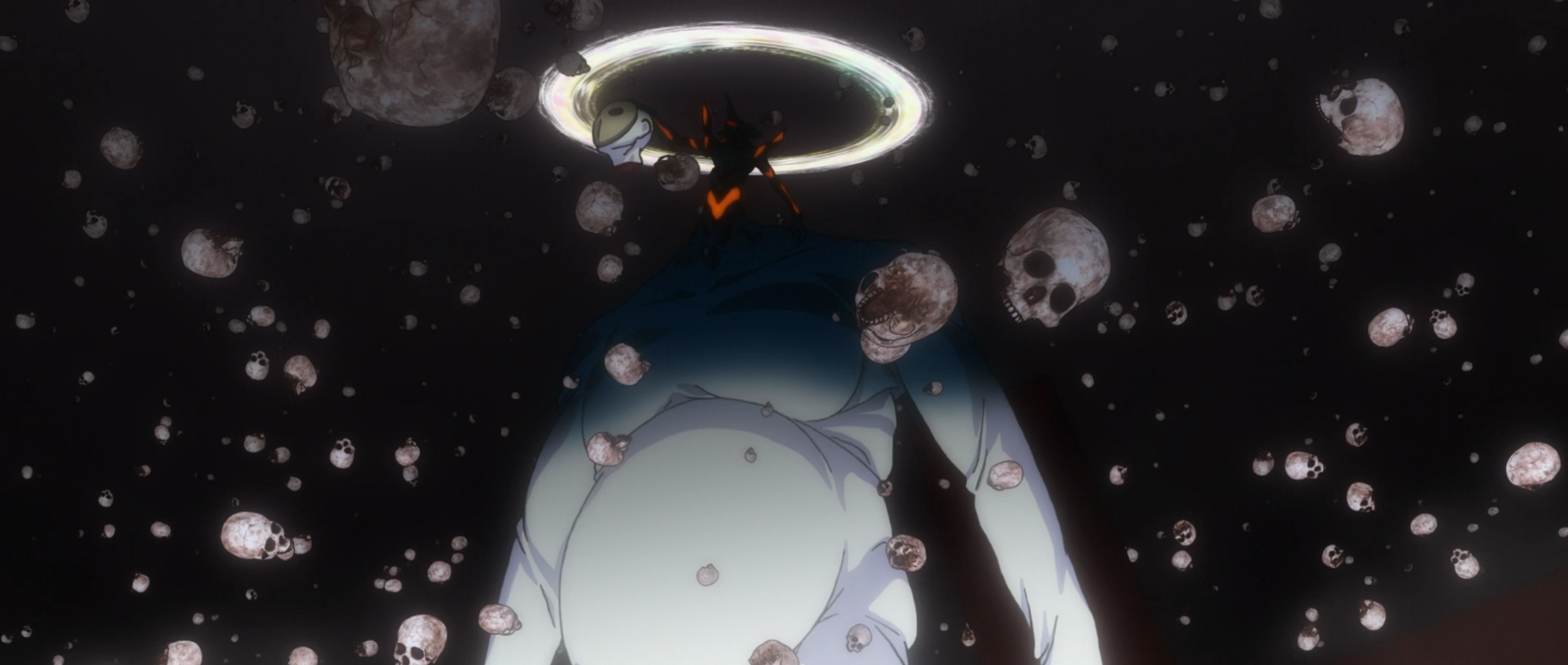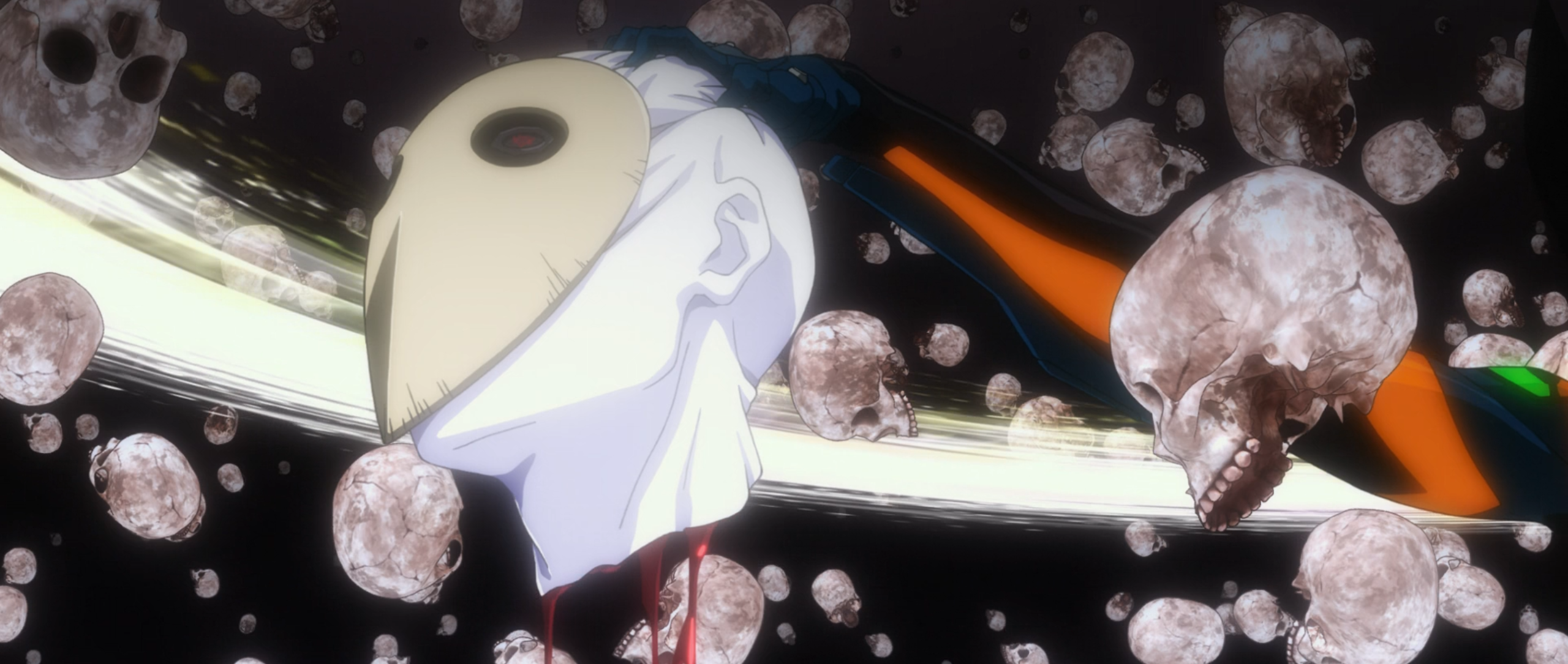 The Mass Production Evangelions take custody of Unit-01. The automated Evangelions use replica Lances of Longinus crucify the purple Evangelion and impose the stigmata of Christ on its hands. The Mass Production Evangelions then assume a formation around Unit-01, and begin to overload their S² engines to create a vast Anti-A.T. Field, causing an eye-shaped explosion that engulfs much of Japan, exposing the Black Moon.